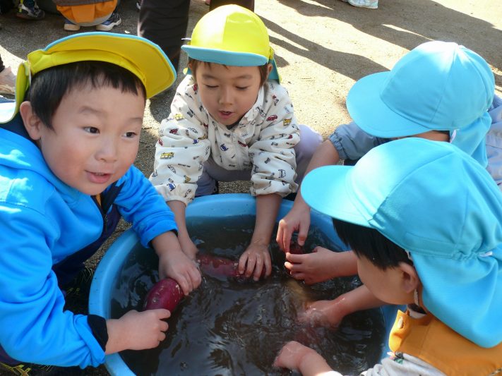 沢山ほったおいも、焼き芋にする準備からはじめます。